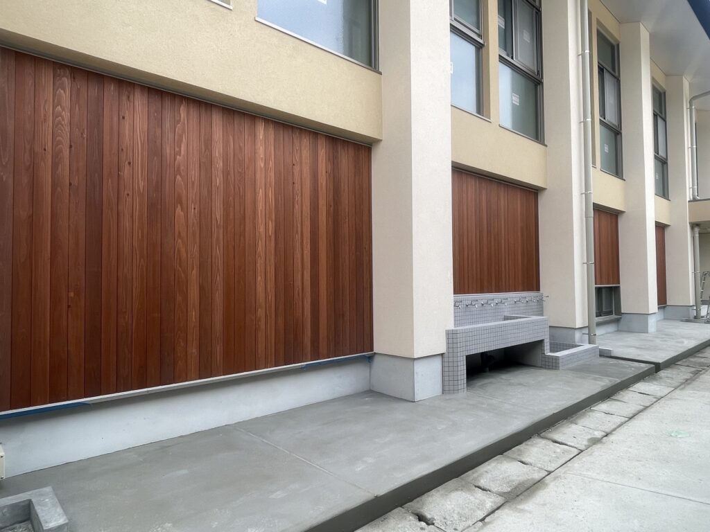 京都市立勧修中学校体育館の防災機能強化等リニューアル工事において、外壁・内壁に京都府内産杉「みやこ杣木」をふんだんに使用した工事を手がけました。中学生の成長期に重要な教育環境の充実と、持続可能な地域資源の活用により、次世代に向けた環境配慮型の学校建築を実現いたします。