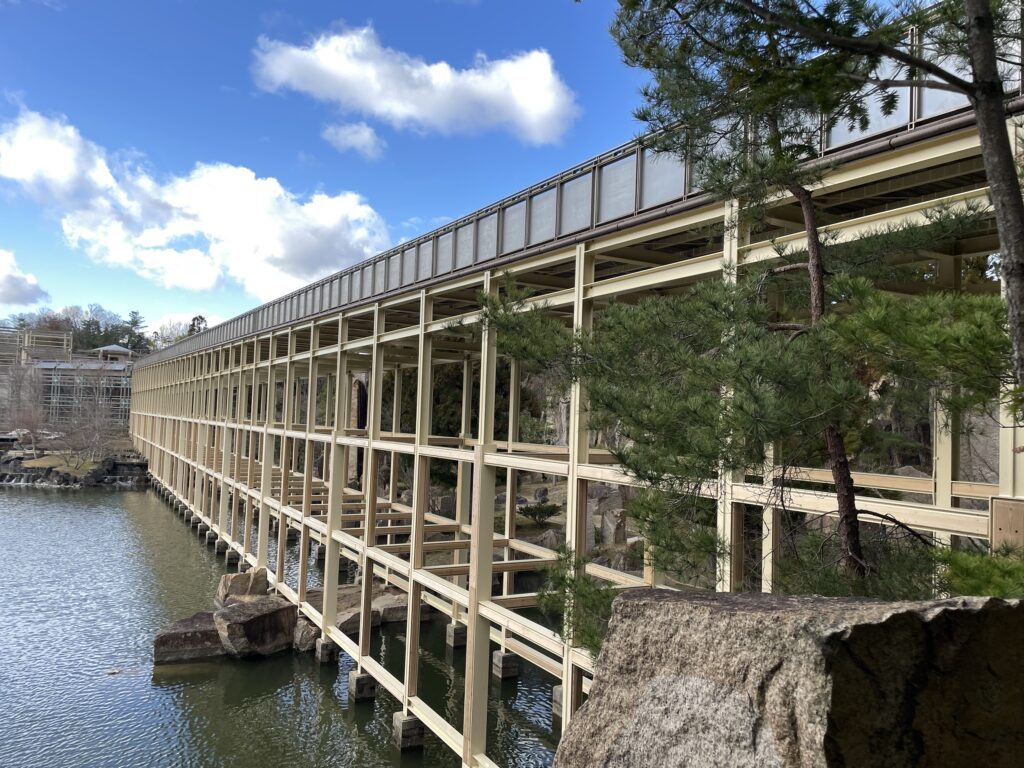 関西文化学術研究都市記念公園における公共都市公園施設整備工事において、全長約120mに及ぶ歩廊橋の橋脚化粧板の撤去・新設作業を手がけました。京都府内産材「みやこ杣木」を使用することで、自然豊かな公園環境に調和した美しい景観を創出し、来園者の皆様に安全で快適な歩行空間を提供いたします。